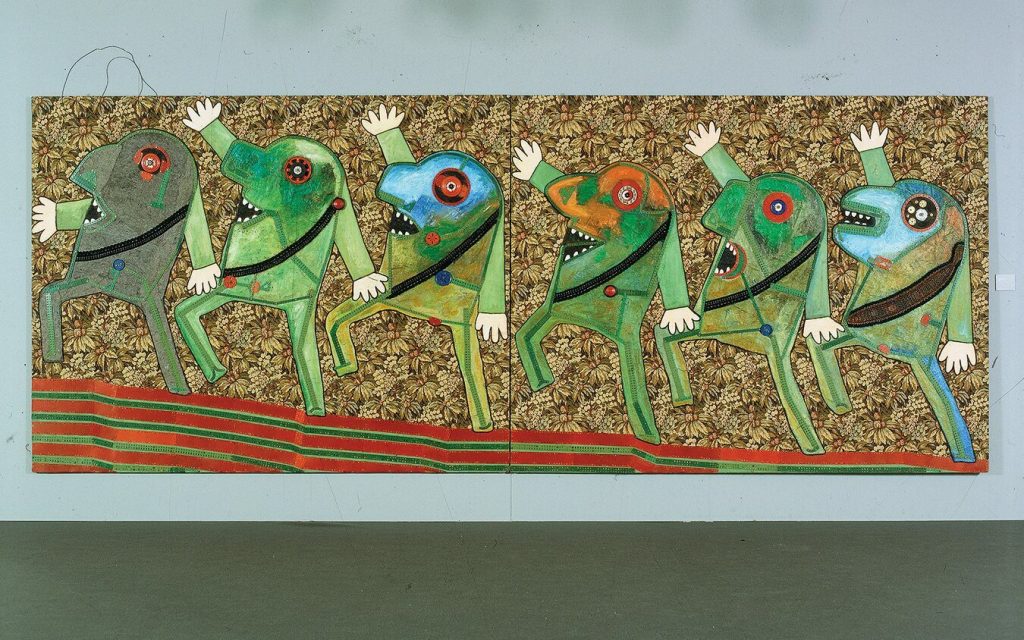 Baj l’ha fatto con un uso audace del colore, con una ricchezza di materiali e con un spirito ora ludico, surreale ed eclettico, ora originale, ironico e dissacrante, fino a cadere spesso nell’assurdo o addirittura nel grottesco.