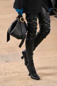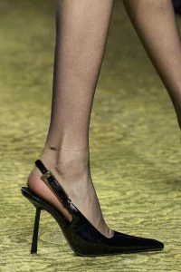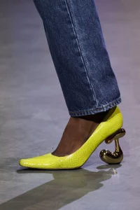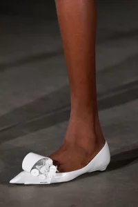 Le scarpe a punta sono ufficialmente tornate di moda, le proposte più curiose sono quelle di Moschino, JW Anderson e Lanvin. Qualcuna dal tocco “arricciato”, vedi Blumarine e GCDS. “Peloso” è invece il sandalo di Sportmax e di Burberry. Tornano in auge anche le ballerine, in vero difficili da estinguere. E gli stivali cuissard, aderentissimi e coperti di strass oppure oversize e in suede. Da annotarsi gli stiletti killer, lunghi, sottili, affilati come coltelli. Ma anche a rocchetto, più romantiche e dal sapore vintage. Le zeppe, sarà perché comode, resistono. Quelle dai profili incurvati sono le più originali, mentre i classici stivaletti neri cambiano i propri connotati attraverso maxi platform, plateau altissimi e block heel.