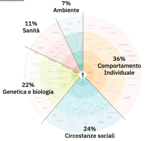 Come appare chiaro, la genetica e la biologia, cioè la nostra natura più intima ereditata da chi ci ha preceduto e le nostre predisposizioni, pesano solo per il 22%. Le fette più importanti di responsabilità vanno a comportamenti individuali o stili di vita (36%) e alle circostanze sociali (24%). A seguire con percentuali minori la disponibilità di e accessibilità di strutture sanitarie (11%) e l’ambiente in cui si vive (7%).