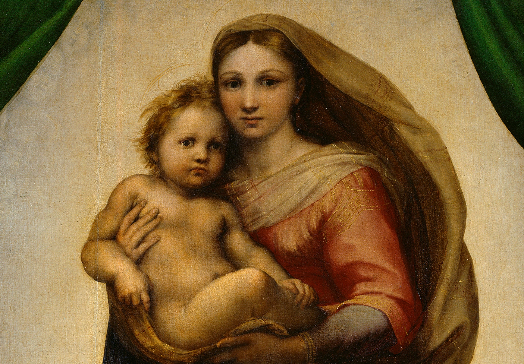 Sono tantissime le opere che La ritraggono con il Bambino Gesù. Per esempio, in Madonna Sistina di Raffaello (1512/13), uno dei massimi capolavori del Rinascimento, la Madonna, con il bambino Gesù in braccio, appare al centro della scena, mentre discende da morbide nubi, ed ai suoi lati si trovano il Papa Sisto e Santa Barbara. La discesa è suggerita dal leggero movimento delle vesti della Madonna, che si avvicina, avvolta dalla luce. In basso, sono raffigurati i due noti angioletti, paffutelli e con i riccioli scompigliati, appoggiati ad un finto parapetto.