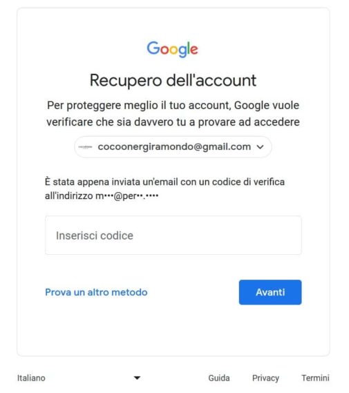 A questo punto dovrai inserire il codice di sicurezza che ti verrà inviato all’indirizzo email di recupero che hai indicato in fase di registrazione del tuo account.