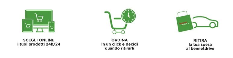 Con il servizio Bennet Drive puoi fare la spesa e ritirarla in negozio. Semplice, comodo e veloce. Potrai fare la spesa scegliendo tra più di 10.000 prodotti e passare direttamente a prenderla nel punto vendita più vicino a te, nella fascia oraria che preferisci. Troverai tutte le promozioni e la solita imbattibile convenienza di Bennet.
