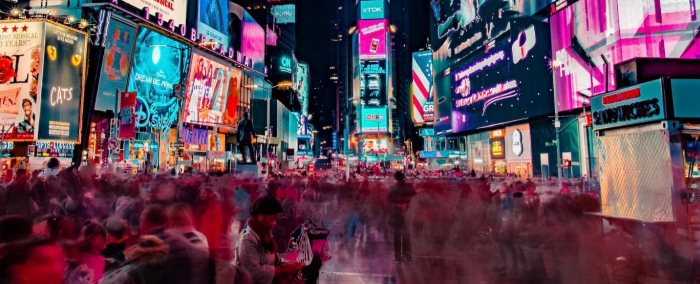 Con la punta del naso all’insù ammira i colori notturni della metropoli e cammina in libertà circondato dai grattacieli più famosi degli Stati Uniti.