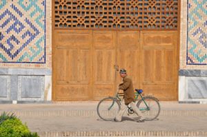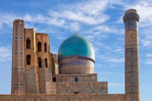 medioevo e qui vennero costruite le tre università medievali che fanno da quinta alla piazza: la madrasa di Ulugbek, il sultano astronomo, la madrasa di Sher Dor, con i felini rappresentati nel grande mosaico e la Tillya Kori, con i suoi soffitti dorati. Non lontano dalla piazza si trova la cupola blu del mausoleo di Tamerlano. Il grande emiro venne sepolto in una semplice tomba in mezzo ai suoi familiari. La leggenda vuole che chi disturba il sonno del conquistatore scatenerà una guerra devastante.