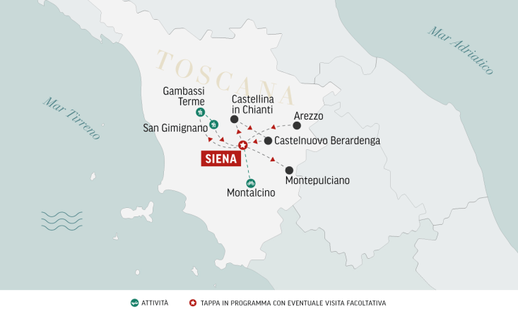 Vivi 5 giorni in “vacanza attiva” in una terra dai paesaggi straordinari, tra escursioni e visite ad Arezzo, Siena, San Gimignano, Castelnuovo Berardenga, Montalcino e Montepulciano.