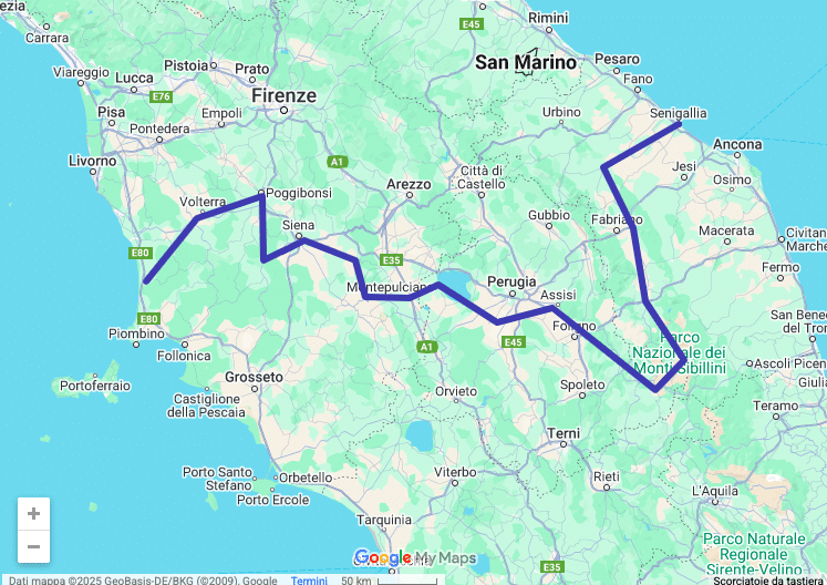 Guidato dal nostro team italiano, pedalerai attraverso tre splendide regioni italiane: Toscana, Umbria e Marche. Pedalerai lungo un mare incantevole, attraverserai colline ondulate e le montagne appenniniche, passando per villaggi nascosti ricchi di storia e immersi nella natura incontaminata, in un paesaggio unico al mondo.