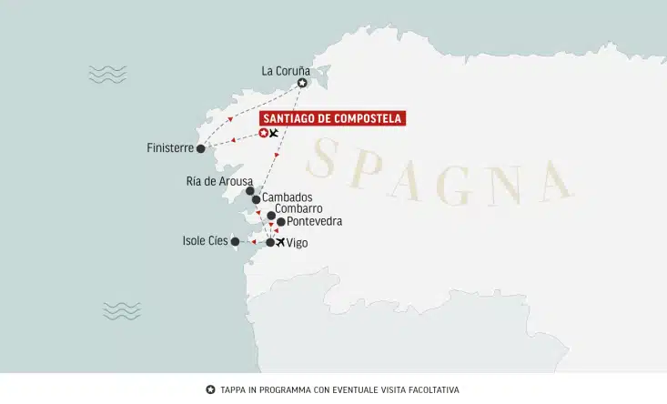 La giornata di oggi è dedicata alla scoperta delle “rias” della Galizia, bracci di mare che si incuneano nell’entroterra con scenari mozzafiato. Sono anche luoghi in cui si sviluppano allevamenti di frutti di mare e dove si producono alcuni dei vini più pregiati della Spagna. Raggiungiamo Cambados, caratteristico villaggio celebre per la produzione del vino albarino. Dopo una breve passeggiata, raggiungiamo una delle bodegas (cantine) della zona per una degustazione. Il pranzo è libero. Ci spostiamo poi sulla penisola di O Grove, da cui partiamo per una navigazione nelle acque del fiordo di Arousa con degustazione di frutti di mare. In serata arriviamo in hotel a Vigo dove la cena è inclusa.
