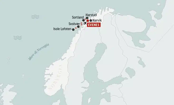 La mattina partiamo per un’escursione in gommone nel Trollfjord, spettacolare fiordo dalle pareti ripide nell’arcipelago delle Lofoten, dove si possono ammirare aquile di mare dalla coda bianca e una grande varietà di uccelli. Il pranzo è libero. Partiamo per Narvik, situata in una splendida posizione tra fiordi e montagne. La cena è inclusa.