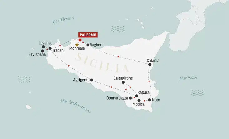 La mattina è dedicata a una visita guidata di Palermo. Passeggiando per i suoi vicoli raggiungiamo il Mercato del Capo, per poi visitare la Cattedrale arabo-normanna. Proseguiamo poi per Piazza Marina, le Mura delle Cattive e il lungomare. Concludiamo con la visita di Palazzo Steri e della Chiesa di San Giovanni degli Eremiti. Il pranzo e il pomeriggio sono liberi. Chi lo desidera può partecipare a un’escursione facoltativa a Monreale. La cena è libera.