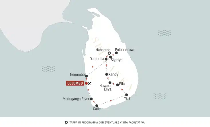 Spiritualità e ospitalità. Attraversando città sacre come Kandy e Dambulla, e salendo in cima alla leggendaria Rocca di Sigiriya, entreremo in contatto con la storia e la spiritualità profonde dello Sri Lanka. Le genti dell’isola ci accoglieranno con calore e ogni incontro ci svelerà un po’ di più della loro cultura. L’intera isola sembrerà voler lasciare in noi un segno indelebile, invitandoci a portare in valigia il ricordo di un viaggio intenso, scandito dai colori, dai sapori e dall’anima vibrante di questa terra.