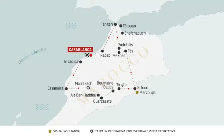 Il nostro viaggio in Marocco è giunto al termine. In base all’orario del volo di ritorno, possiamo disporre ancora di un po’ di tempo libero da dedicare allo shopping o alle visite in autonomia, prima di venire accompagnati all’aeroporto in tempo utile per salire a bordo del volo di rientro in Italia.
