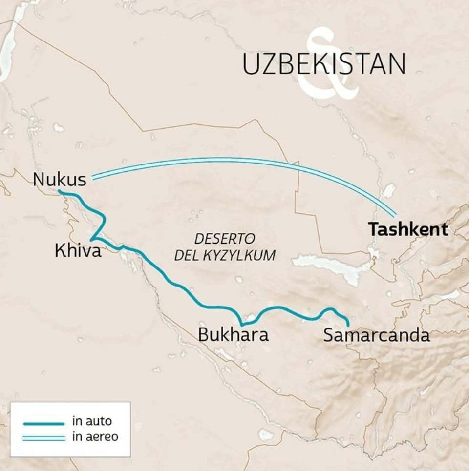 Un viaggio lungo la mitica Via della Seta, nel cuore dell’Asia centrale, tra le antiche città di Khiva, Bukhara e Samarcanda, strette fra il Deserto del Kyzylkum a nord e il Karakum a sud. Per secoli le lunghe carovane hanno sostato in queste tre oasi, all’ombra delle grandi moschee dalle cupole blu con i loro svettanti minareti e una di queste, la celebre Samarcanda, fu scelta da Tamerlano, come splendida capitale per il suo impero. L’erede di Gengis Khan, nonché ultimo conquistatore delle steppe, la volle così bella che fece giungere i migliori artigiani dell’India per decorarla. Preambolo prezioso sarà la toccata a Nukus, per scoprire opere d’arte incredibili, sottratte a un triste destino e testimoni di una silenziosa disubbidienza. Al termine del tour si potrà estendere il viaggio per una visita facoltativa della Valle di Fergana.